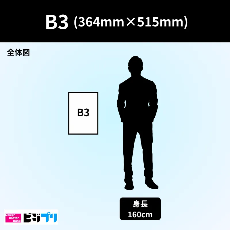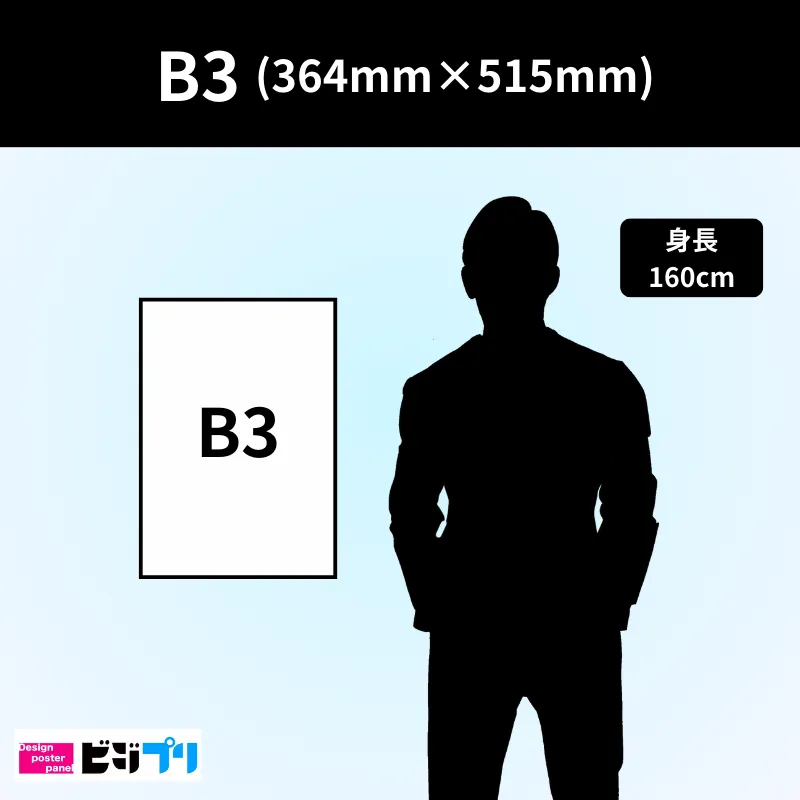 B3サイズはJIS規格の紙サイズで、寸法は 364mm × 515mmm です。ポスターやトレーシングペーパーに使われることが多く、迫力のあるビジュアルを展開する際に適しています。